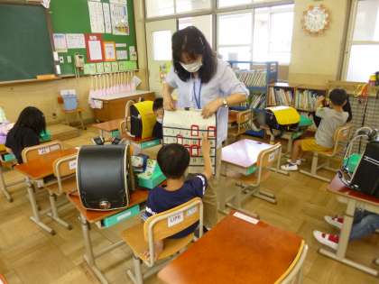 はじめに「おどうぐばこ」の片付け方と朝の準備の仕方を学習したあと,国語や算数,安全の勉強などをしました。休校中の生活とちがう時間の流れで学校生活が進んでいくので,少し疲れた様子も見られましたが,どの子も自分の席でしっかりがんばることができました。