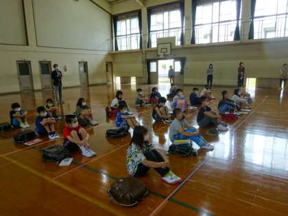 6月1日,全員登校の日です。マスクを着用した子ども達がどんどん登校します。手洗い,消毒をして,体育館へ。まずは,校長先生からのお話です。感染拡大しないためにマスクを着用すること,手洗いをすること,人との距離を保つことなどのお話がありました。