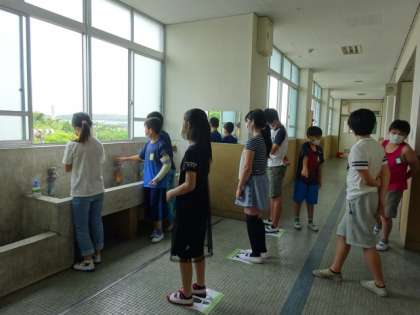 水分補給やトイレ休憩でも人との距離を保っています。5年生と6年生が混じっても上手に並んでいました。