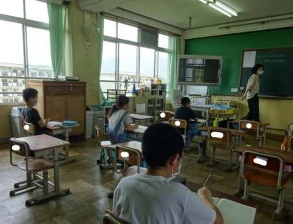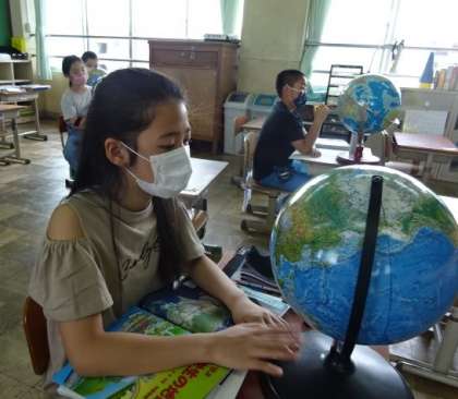 社会科「世界の中の国土」では,地球儀を使って気付いたことを発表していました。