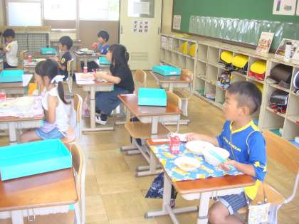 給食の配膳も対策をしております。まず,低学年は,配膳中は,マスクをして座って待っておきます。一切,当番活動はいたしません。教職員が,給食室ホールから,教室まで運び,配食・配膳をします。全部配り終えたら,子どもたちは,マスクを取って静かにいただきます。しばらくは,この方法を続けます。