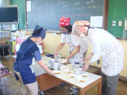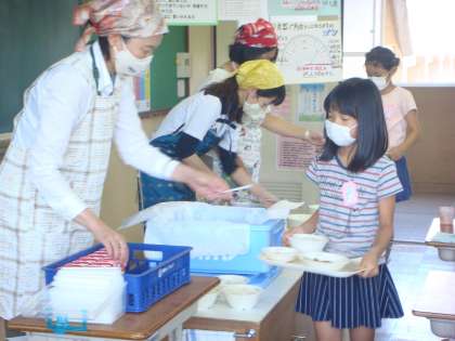 高学年は,配食は,教職員がします。配膳は,子どもたちが自分たちのエプロンを持ってきてします。