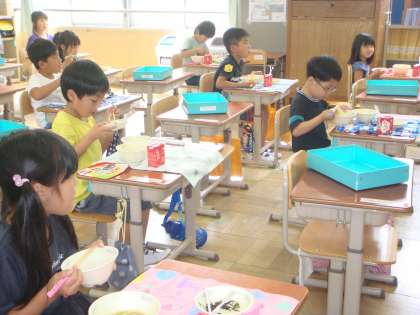 1年生の教室をのぞくと,担任の先生は,やっと配膳を終えて子どもたちが食べ始めたのを見ておられたときです。ある子が「先生も食べな。」と声をかけているのです。おしゃべりは,禁止なのですが,思わず,「やさしいですね。担任の先生のことを気遣って言っているのですね。」とほめてしまいました。