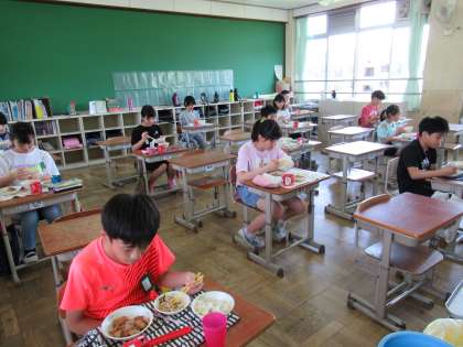 楽しみにしていた給食が始まりました。5年生の時は,曜日ごとにグループを変えたり,みんなで円になって食べたりしていた楽しい時間でしたが,今年は前を向いて静かに食べます。あまりの静けさに戸惑いながらも,「やっぱり給食,おいしいな。」とつぶやいている子どもの声が聞こえ,少しほっこりしました。静かに落ち着いて食べる!このスタイルはこのスタイルでいいかもしれません!!