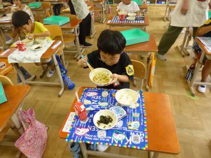 お昼はBはんの子どもたちの「はじめてのきゅうしょく」です。4時間目に準備の仕方や待ち方の学習をしたので,準備や待ち方はどの子もバッチリでした。今日のメニューは,カレーうどん。「おいしい!」といいながら食べていました。