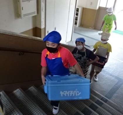 11時頃には,こんな声も聞こえてきました。そして,待ちに待っていた給食の時間です。念入りに手洗い,消毒をして,エプロンや三角巾をつけます。そして,配膳をして静かに