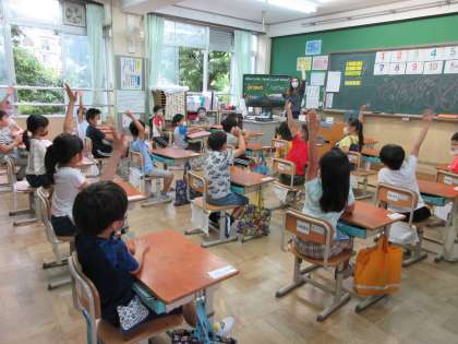 サラ先生の「HELLO!」のあいさつに,みんな嬉しいけれども,返事に困ってもじもじ。HELLOW SONGを歌って,1年生の時に習ったあいさつを思い出しました。