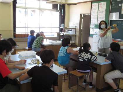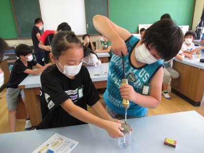 理科のものの燃え方の学習で,気体検知管を使って,燃やす前と燃やした後の空気について調べました。初めて使う「気体検知管」に少し緊張しながらも,慎重に実験を行い,燃やす前と燃やした後の空気の変化に気づくことができていました。