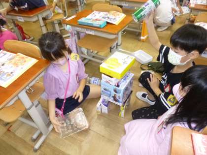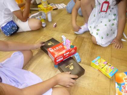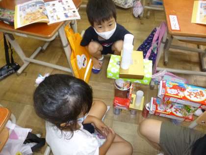 お家から持ってきた空き箱や空き缶を使って,どうぶつやのりものなどを作りました。立てたり,積んだり,転がしたりしながら楽しく作っていきました。