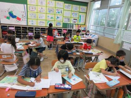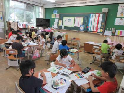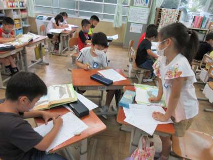 あらすじを読めば,読んだことがない人もどんな本か知ることができます。紹介カードの作り方は,「スイミー」で学びました。今度は,自分たちで,どんどん進めています。同じ本を選んだ友だちと,お互いの書いたものを読み合いながらあらすじづくりを,夢中になって書いています。どんな紹介カードが出来上がるか,お楽しみです。