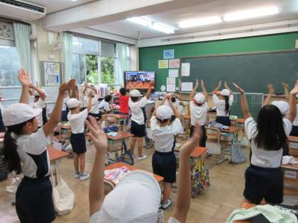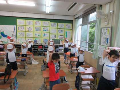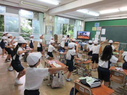 雨で運動場での体育ができませんでした。今日は体育館も使えなかったので,教室で体ほぐしの運動をしました。ストレッチをしたり,ジャンプをしたり,回ったりしながら楽しくダンスをしました。ダンスをすると心も体もうきうきして,梅雨空が明るくなったようでした。