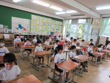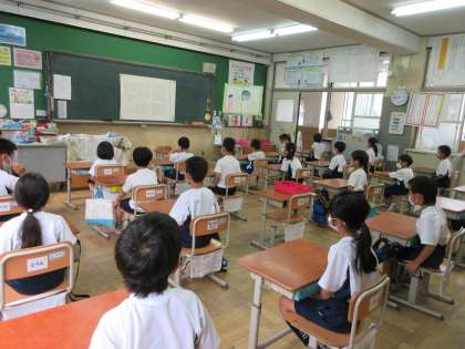 教室での終業式でした。校長先生のお話を放送で聞きました。お話の中で,「夏休みにがんばりたいことは何ですか。考えてください。」という問いに,2年生のみんなは,頭の中でやりたいことを いろいろ考えている様子でした。「虫の絵とけんきゅうをしたい。」「本をたくさん読みたい。」「体をうごかして,スポーツをがんばる。」「おかあさんと,むずかしいりょうりをつくる。」など,夏休みのやりたいことをカードに書いていました。今年はいつもより短い休みですが,いい夏休みになるよう願っています。健康に気をつけて,元気にすごしてくださいね。