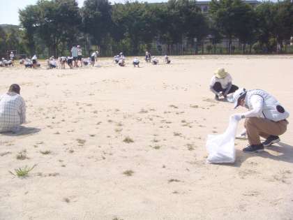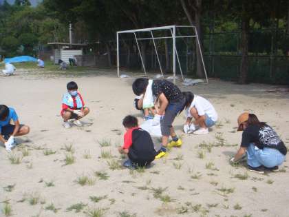 滝のように流れる汗と,とっても頑固な根っ子と闘いながらがんばりました草引き!1年生が「やってもやっても変わらないね・・・・。」と少々,あきらめムード。「いえいえ,少しずつですが,きれいになってきていますよ。こんなに,力を合わせてがんばっているのですから・・・・。」