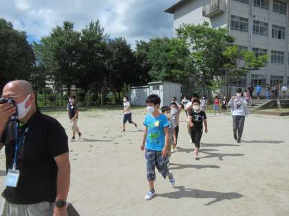 今回は西京消防署の方々にも来ていただき,火災からの避難の仕方について確認しました。また,消火器の使い方についても教えていただきました。