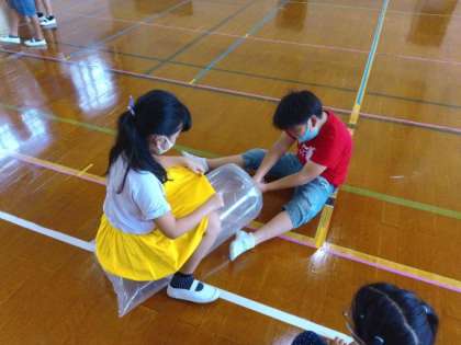 途中で空気が「ヒュ〜〜〜〜」と抜けていくグループもあって,「しぼんだー!」と楽しそうに活動していました。