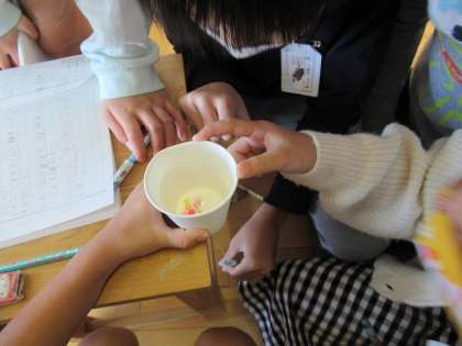 「ひもをこすって音を出すと,中のビーズがはねてるよ!」