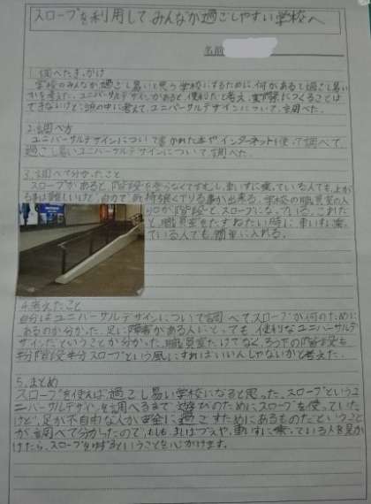 学校で過ごすどの学年の子ども達も,学校で働く大人も,来校された方々も過ごしやすくなるために考えました。そこで,今の学校のバリアフリーやユニバーサルデザインに目をつけて調べました。本やインターネットなどでバリアフリーユニバーサルデザインのことを知り,驚くことが多くあったようです。そして,それらから引用したことや自分の考えを書きまとめて報告書を仕上げました。