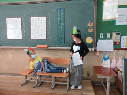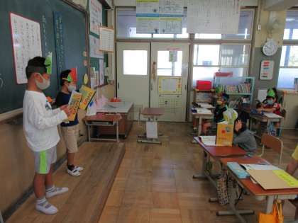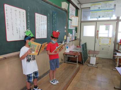 国語科の学習で音読劇をしました。読みたいところを選び,読みの工夫や動きの工夫を入れて二人組で音読しています。がまくんが待ちくたびれて,かえるくんが そんながまくんをなだめたり励ましたりしている様子が音読に表れていて,見ていてほほえましかったです。