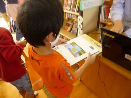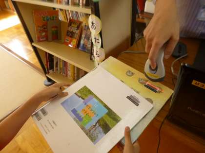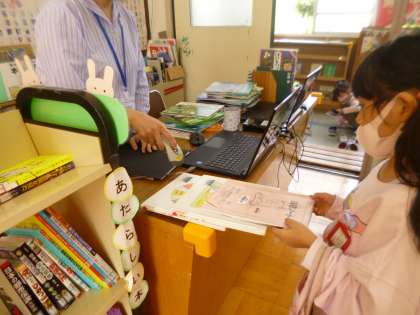 図書館司書の石津先生が,貸出・返却の手続きがしやすいようにと考えて,本のバーコード部分を差し出しています。借りたり返したりするのが,どの子も上手になりました。