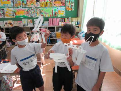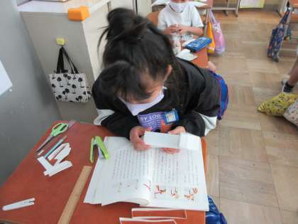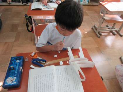 国語科「馬のおもちゃを作ろう」の学習をしています。説明文を読んで,大事だなと思う文章に線を引きながら馬のおもちゃを作っています。何度も読み返しながら,何センチメートルのものが何個いるか数を確かめていました。出来上がった後は,顔やしっぽをつけて動かし,楽しみました。おもちゃを作った後,どんな書き方がわかりやすいか考えました。