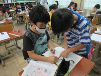 まとめる時に,「ここはどうしたらいいのかな。」と友達に聞いたり,教えてあげたりして協同的に学習しています。