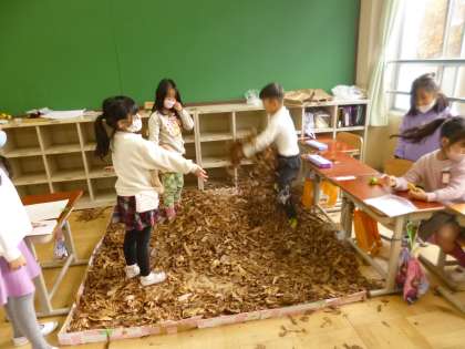 秋の自然物を使って「あきのわくわくまつり」を開きました。お店屋さんとお客さんに分かれ,役割を交代しながら,みんなで楽しみました。