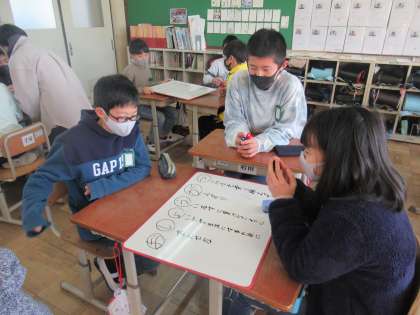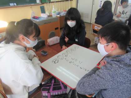 3学期初めてのコミュニケーションタイム!今日は3学期の目標を,『おしょうがつ』のあいうえお作文で表現することに挑戦しました。よりよい言葉はないか・・・とみんなで意見を出し合っていました。なんと,「うららか」や「おもむき深い」という言葉を入れてきたグループもいました!完成したユーモアあふれる作文を全体で共有し,笑顔あふれる素敵な時間となりました。3学期もコミュニケーションの楽しさを味わいながらコミュニケーション力の育成に取り組んでいきたいと思います。