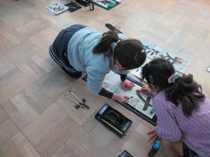 「友だち」という3文字の毛筆は初めてですが,友達とアドバイスをし合いながら,真剣に書いています。