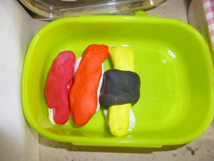 図画工作の時間に,粘土を使ったお弁当作りを始めました。絵の具を練りこんで色付けをし,丸めたり伸ばしたりしながら,お弁当に入れたいごちそうを作っていきます。どの子も,だんだん出来上がっていく自分だけのお弁当作りを楽しんでいます。