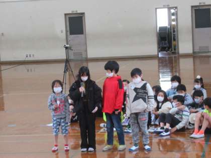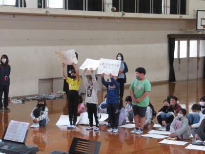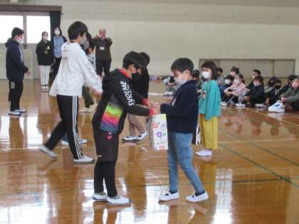 6年生へのプレゼント渡しと3・4年生の発表の様子です。