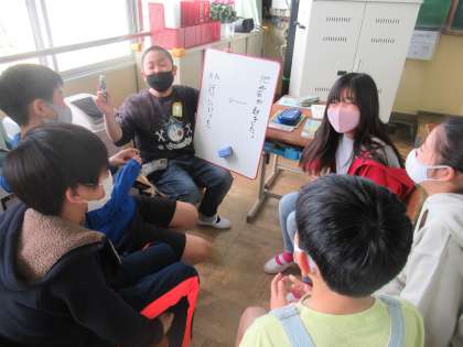 6年生最初の国語科の授業です。今日は「つないで,つないで,1つのお話」という言葉の準備運動をしました。5〜6人グループになり,一文ずつつないで2周する間に1つのお話を完結させます。最初の一文と最後の一文は決まっているため,なんとか最後の一文につなげるためにみんなで知恵を出し合ってお話をつないでいました。それぞれユーモアあふれるお話になっていて,どのグループも楽しく活動していました。