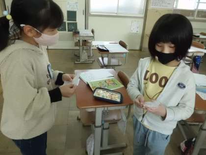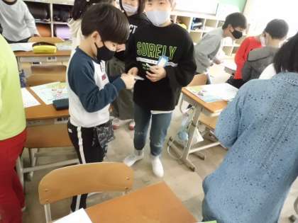 今日は,3年生の外国語活動の時間に,ペアの友達と挨拶をして,名前を伝え合う活動をしました。初めは,「英語ってちょっと苦手だな。できるかな。」と言っていた子も,少しずつ外国語に慣れ,「Hello,I'm〜.」「Thank you.」「See you.」と笑顔で言えるようになりました。活動の終盤には,友達と交換した「Helloカード」を大事そうに,ワークシートに貼っていました。3年生みんなの「やってみよう!」のその気持ちに大きな拍手!!