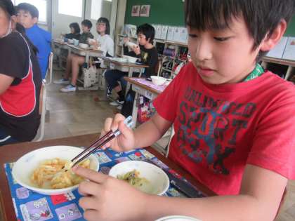 月に1回の「なごみ献立」。今月は「春野菜のかきあげ」でした。かきあげに入っているたくさんの春野菜が動画で紹介され,かきあげとにらめっこしながら一生懸命探しだす子どもたち!見つけたときは嬉しそうに指をさしていました。食材を楽しみながらおいしくいただきました。