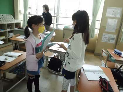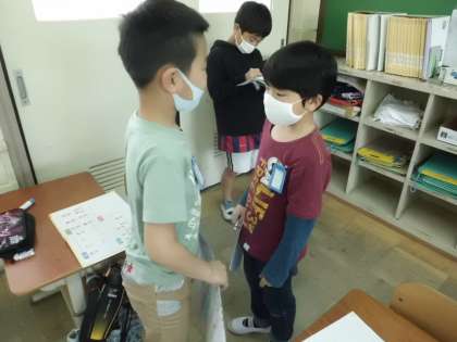 3年生の外国語活動の時間に,友達同士で様子を尋ねたり,ジェスチャーを付けて答えたりする活動をしました。自分の気持ちがよく伝わるように,表情やジェスチャーを付け,自分なりの工夫を生かしながら楽しく活動する姿がきらりとしていました。
