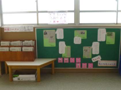 北校舎の東かいだんを上がってすぐの掲示板のところに,「新聞コーナー」を作りました。少しでも新聞に興味をもち,実際に手に取ってくれればいいなと思います。