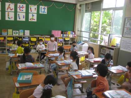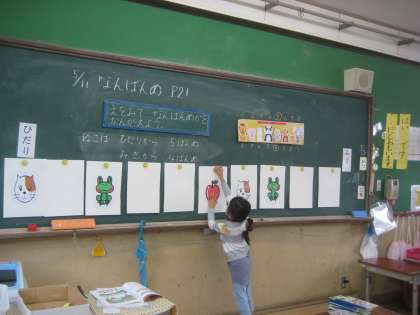 算数科で「なんばんめ」の学習をしました。最後に絵合わせゲームをしました。「右からなんばんめです。」「左からなんばんめです。」と言ってカードを選ぶ子と,言われたカードをめくる子と二人ずつ順番に回しました。同じ絵が出た時は,みんな大喜びで拍手をしていました。