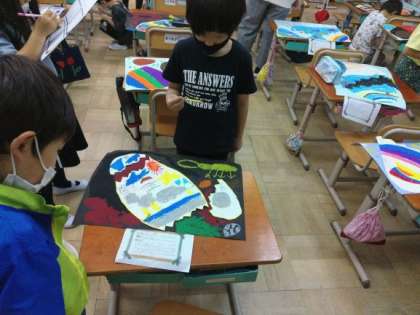 6時間目に図画工作で描いた「ひみつのたまご」の作品鑑賞会をしました。