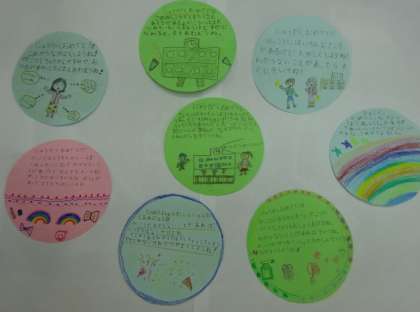 全校で1年生にプレゼントするメダルを作ります。4年生の担当は,メッセージづくりです。