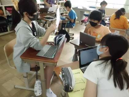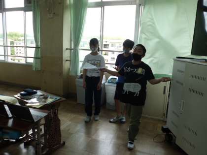 6年生は,来週のパフォーマンスチャレンジ本番に向けて,グループごとに練習中・・・。発話だけでなく,より相手に伝わりやすくするための工夫をユーモアたっぷりに取り入れています。「初めの,Welcome to Japan.はみんなで言おうよ!」「ジェスチャーもつけてみよう!!」子ども達のアイデアが盛りだくさんで,どんどんレベルアップしていく6年生☆やる気と個性が光るステキな時間になりました。