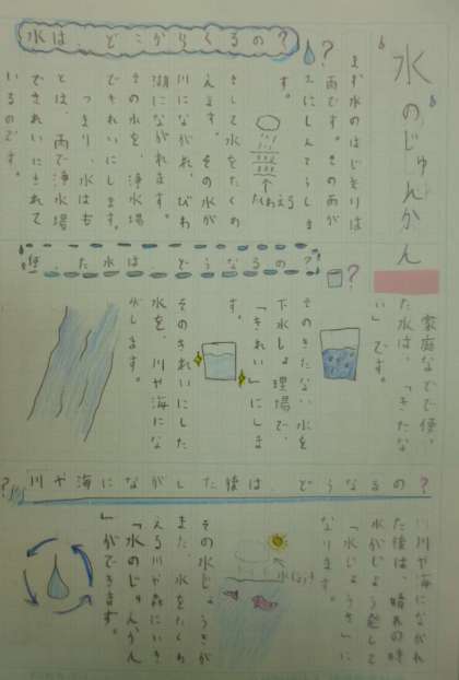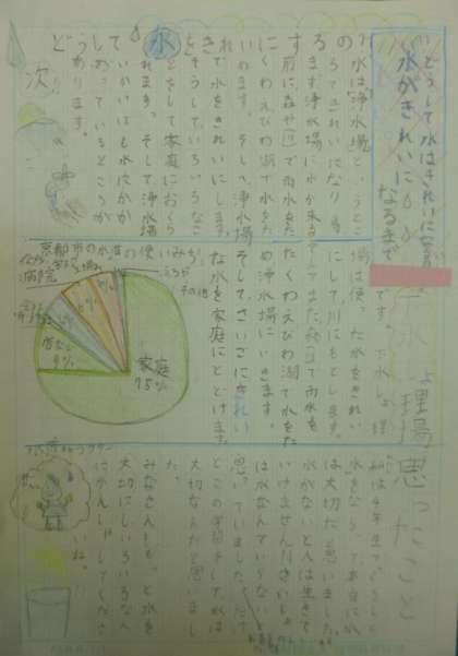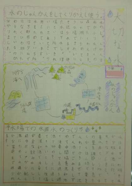 「くらしと水」の学習で分かったことを,はがき新聞にかきました。京都市の水道水は琵琶湖からきていること,浄水場できれいな水道水を作っていること,水は循環していることなど,学習の中で分かったことを,自分なりにまとめることができました。