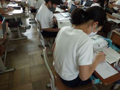 5年生の社会科の時間,今日は,「あたたかい気候を生かした観光と沖縄の課題」について考えました。導入時にちょうど子ども達の頑張りを見に来てくださった校長先生に,沖縄の自然と歴史について話していただき,子ども達は熱い眼差しで聞き入っていました。学習から見えてきた沖縄の課題・・・それは,「温暖化によるさんごの白化」「開発による赤土の流出」という美しい自然が壊される現実でした。「自分達にできることはないか・・・」さっそく考え始めた子ども達。子ども達と共に私たち大人も考えていかなければいけない大切な大切な問題です・・・。