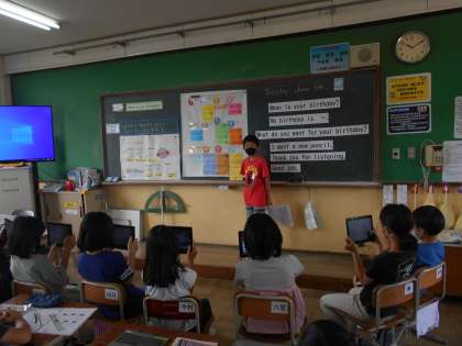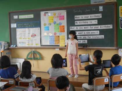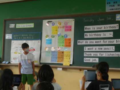 今日は自分の誕生日を伝えたり,誕生日に欲しいものを伝えたりしました。学習した表現を生かして,みんな頑張って伝えることができました。また,発表の様子をGIGA端末を使って撮影しました。自分の発表を記録し,今後の学習に生かしていきたいです。