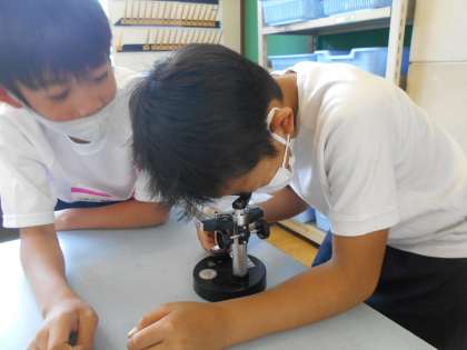 メダカの卵を双眼実体顕微鏡を使って観察しました。顕微鏡のピントを合わせたり,卵を見える位置に動かしたりすることが難しかったですが,見えた瞬間「見えた」と歓声が上がっていました。「目玉が見える。」「何かが流れているように見える。」など,しっかりと観察をし,スケッチしていました。