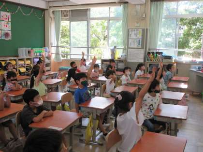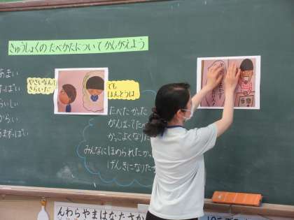 給食のお話を栄養教諭の先生にしていただきました。今回は,給食の食べ方についてです。野菜の苦手な男の子が,食べることができるようになった「まほうのたべかた」のお話を聞きました。おまじないカードをもらって,カードに書くと,ふしぎふしぎ,苦手なものが食べれる自信がでてきました。給食の時間に,このカードをもって食べるようにするといいですね。