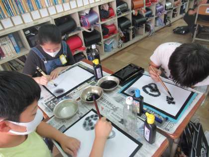 総合的な学習の時間に「伝統文化」について探ってる6年生ですが,今回は「墨絵」を体験してみました。まずは,墨の濃淡の感じや筆などの扱い方を考えながらいろいろな表し方を試してみることに!「グラデーション」や「にじみ」,「かすれ」に挑戦しました。最初は,墨と水のバランスに苦戦していた子どもたちですが,慣れてくると墨の美しさや表し方のよさ,面白さを感じながらいろいろなことを試していました。