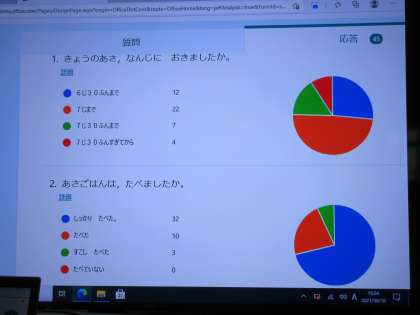 先週,大島先生から習ったアンケートのやり方を思い出しながらしました。早くできた子は,近くのお友達に教えていました。集まった集計を見ると,あらら,送信を何度もしたのか実際の人数よりも多くなってしまいました。来週の「けんこうかんさつ」では送信を1回にすることを確かめました。そして,早寝,早起き,朝ごはんの習慣を身につけていくことを,がんばります。