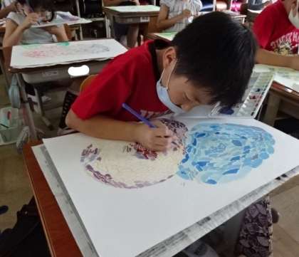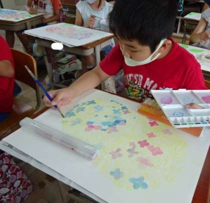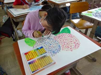 「アジサイをかこう」では,色づくりの学習をしました。青と赤,そして白から作り出される色でアジサイの色づくりをしました。絵の具の混ぜ具合で色が変わるので,思う色になるよう色々と試していました。