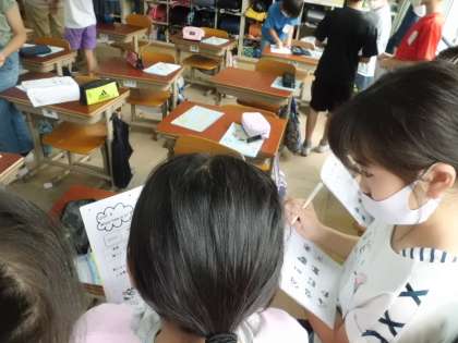 4年生の外国語活動の時間,気に入っている時刻とその理由を伝え合いました。友達と伝え合う“Activity”が大好きな4年生,“I like 5 p.m.”“Why?”なぜ好きなのか尋ねられた〇〇さん,“I like math.”算数が好きなんですね。だから家での宿題の時間が大好きなんだそうです。そして,“I like 7p.m.”と伝えていた〇〇さん,“Why?”とその理由を尋ねられると,「お家の人みんなで夜ご飯を食べる時がとっても幸せで好きだから。」なんですって。なんてステキな理由でしょう!?みんなの好きな時刻やその理由,ちゃんと伝わっていましたよ。“Good job!”