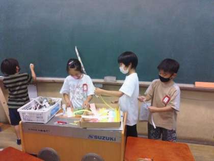 教室だけでは狭くなってしまうので,教室と2年ホールに分かれて活動しました。お互いの教室でどんな風に繋げているのかは,出来上がるまでのお楽しみ。