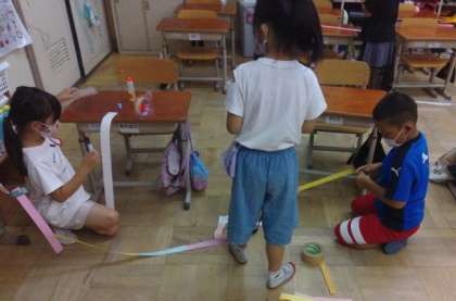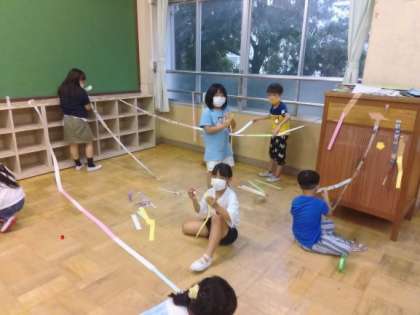 細い紙をつないだり吊るしたりする,造形遊びに取り組みました。
